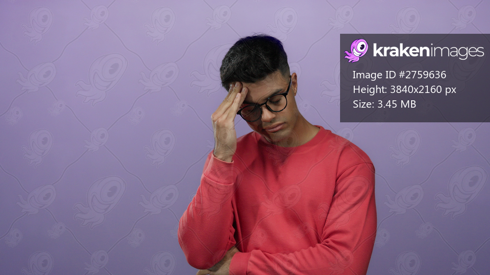 Young man in a red sweater with glasses appears worried against a purple background, highlighting his thoughtful and pensive expression.
