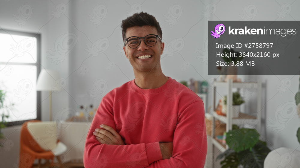 Young man in a red sweater and glasses smiling confidently with crossed arms in a bright indoor room featuring cozy decor and plants.