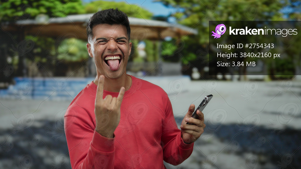 Young man in a red sweater smiles holding a smartphone in an outdoor park setting with trees, showcasing a relaxed and happy moment during a sunny day in a vibrant natural environment. - Kraken Images