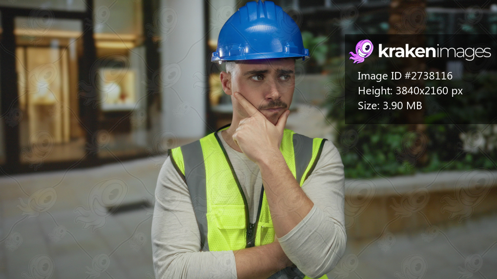 Young man in a reflective vest and hardhat stands thoughtfully on a city street, suggesting an outdoor construction or urban planning context.