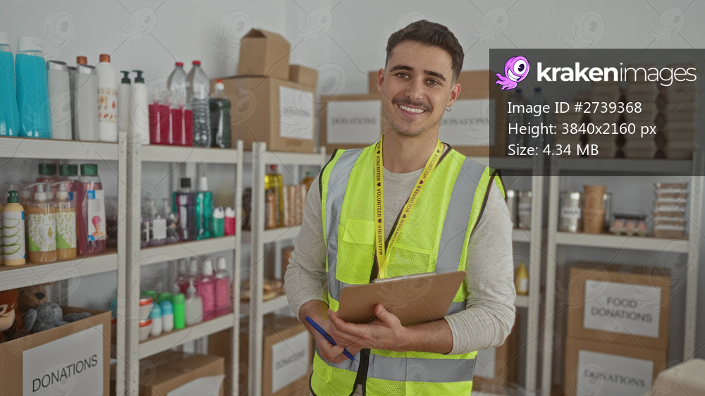 Young man in a reflective vest organizing donations in a charity room, highlighting his volunteer role amidst shelves of supplies.