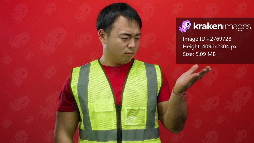 Young man in a reflective vest stands puzzled against a vibrant red backdrop conveying confusion and thought.