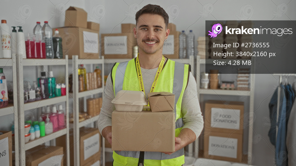Young man in a reflective vest volunteers at a charity donation center, organizing food packages indoors, highlighting community aid efforts.
