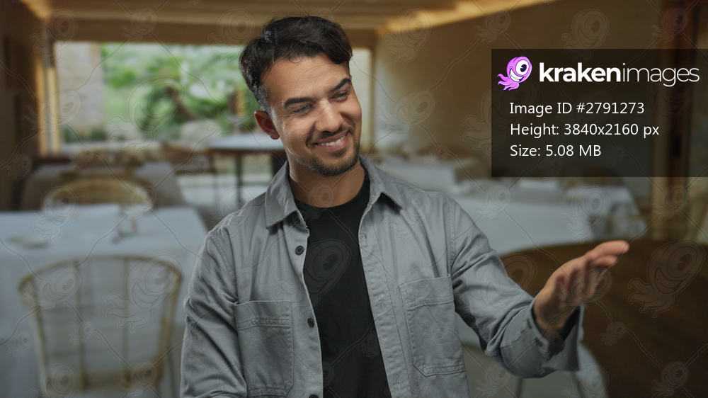 Young man in a restaurant smiling confidently with arms open, creating a welcoming atmosphere in a cozy indoor dining setting.