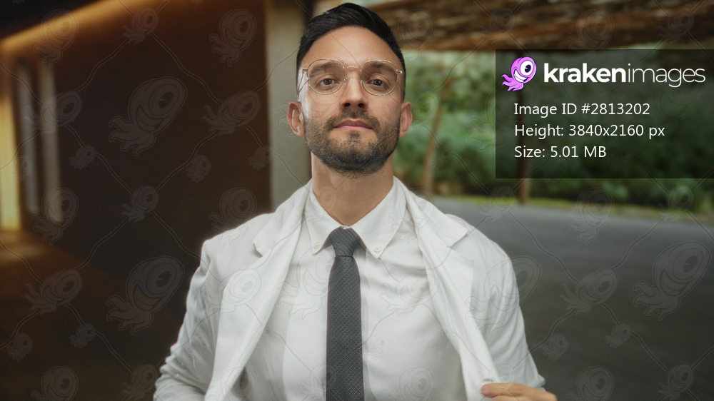 Young man in a white coat standing in a rustic mediterranean house with a serious expression and glasses, surrounded by lush greenery.