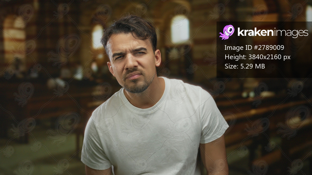 Young man in a white shirt curiously gazing inside a church with soft lighting and rows of benches, conveying a sense of contemplation amidst an indoor setting. - Kraken Images