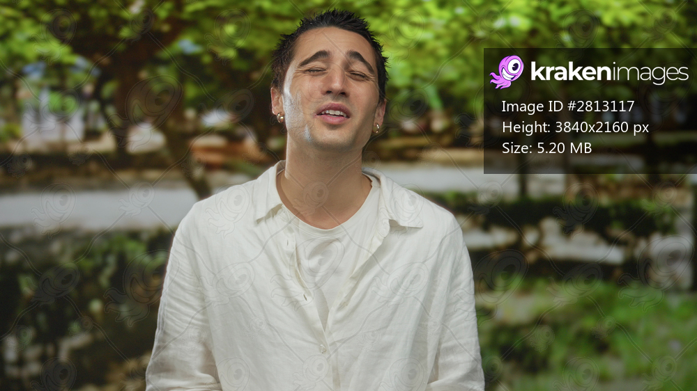 Young man in a white shirt enjoys a sunny day in a lush green park, expressing joy and relaxation in an outdoor setting with natural light and vibrant trees around. - Kraken Images