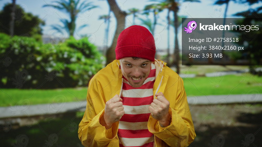Young man in a yellow jacket and red beanie expressing happiness in an outdoor park setting during the day.