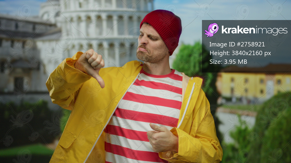 Young man in a yellow jacket and red beanie making gestures against pisa tower backdrop.