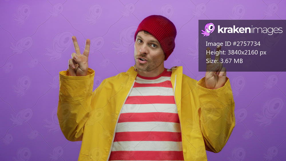 Young man in a yellow raincoat with striped shirt gestures against a vivid purple background exuding charm and confidence.