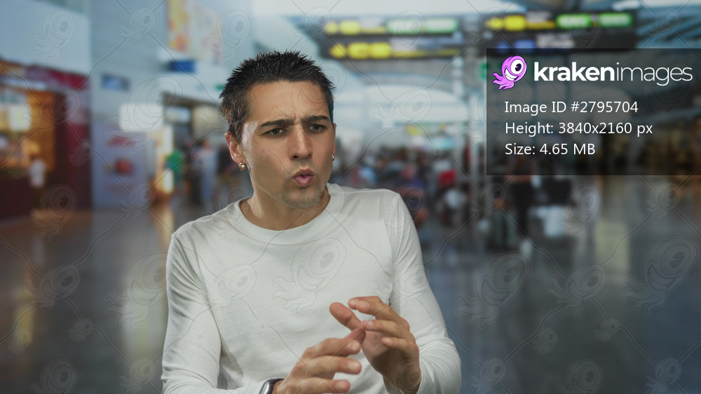 Young man in airport terminal appears cold, clapping hands while wearing a white shirt indoors with blurred background of people and signage.