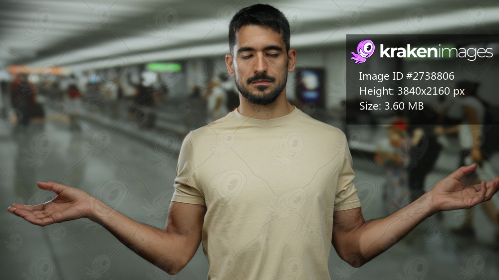 Young man in airport terminal meditating with closed eyes and relaxed posture, surrounded by blurred travelers, highlighting calmness in a busy environment. - Kraken Images