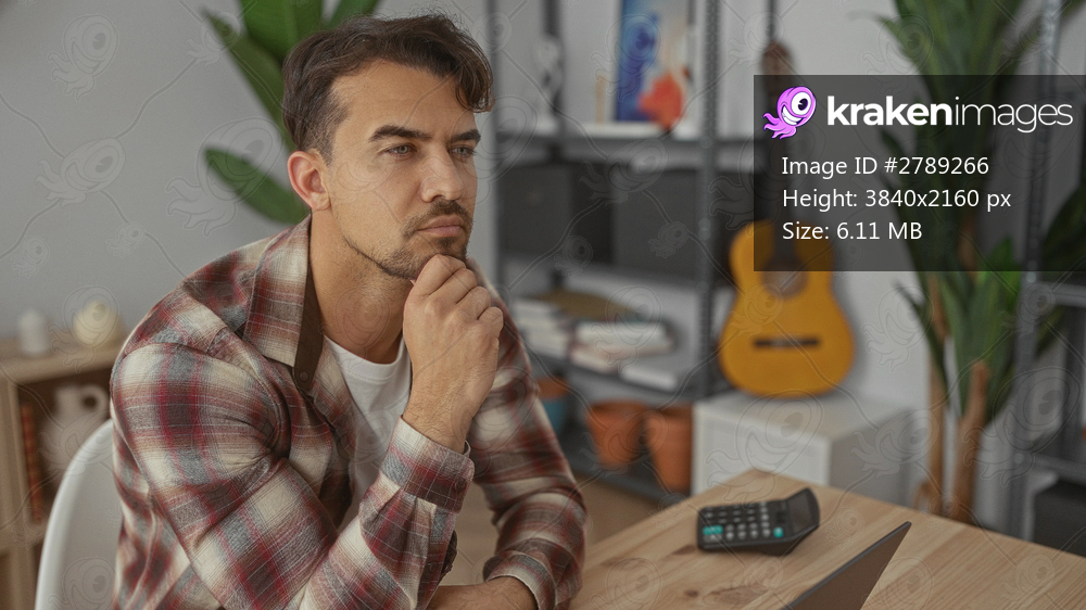 Young man in an office setting analyzing data at a wooden desk with a laptop and guitar in the background conveying focus and contemplation indoors