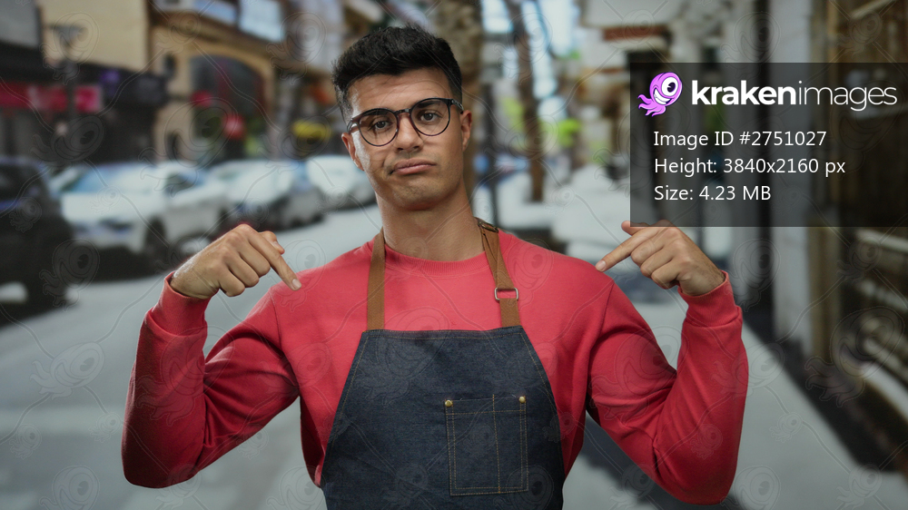 Young man in apron and glasses pointing down on city street with blurred background showcasing vibrant urban setting.