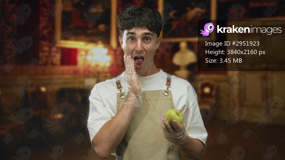 Young man in apron holding a green apple with gloved hands in ornate hotel building; curiosity food prep.