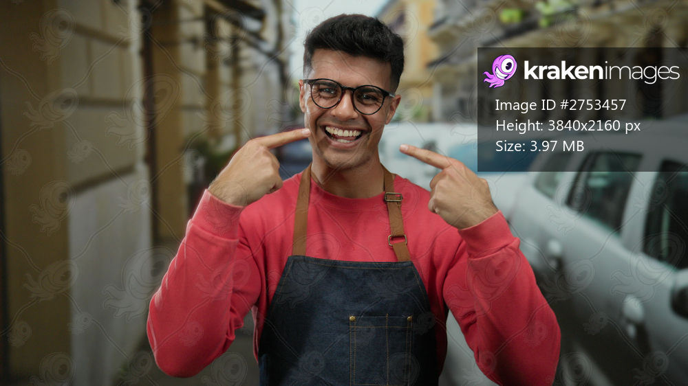 Young man in apron pointing to his teeth while standing outside on a city street in casual attire, showcasing a cheerful and friendly demeanor in the urban environment. - Kraken Images