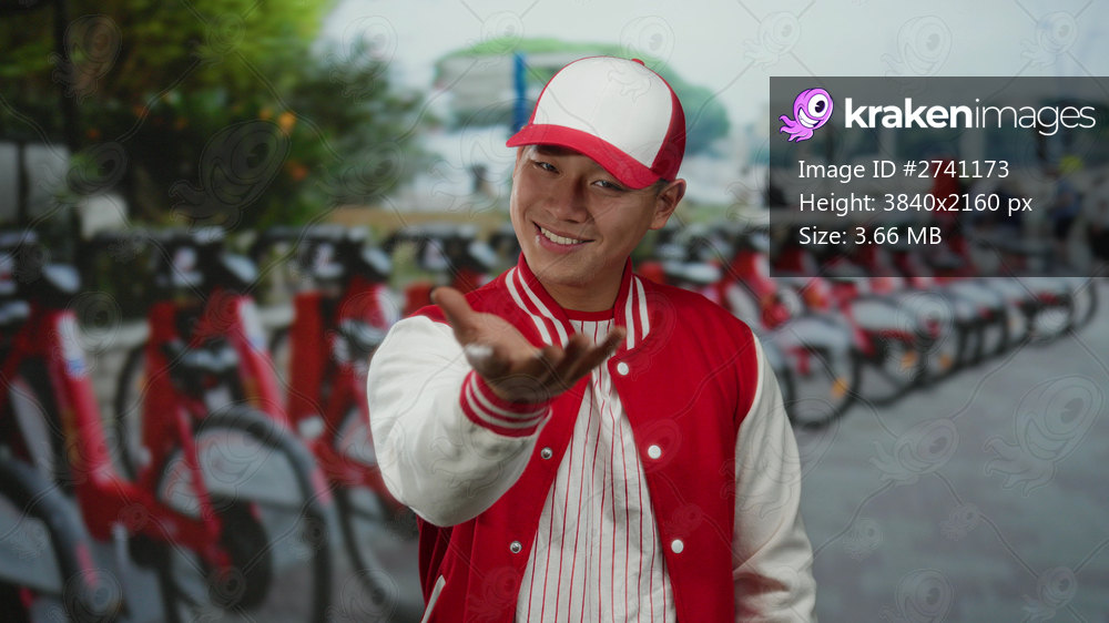 Young man in baseball uniform extends hand to camera smiling on busy city street with rental bikes in background implying friendliness and urban activity. - Kraken Images