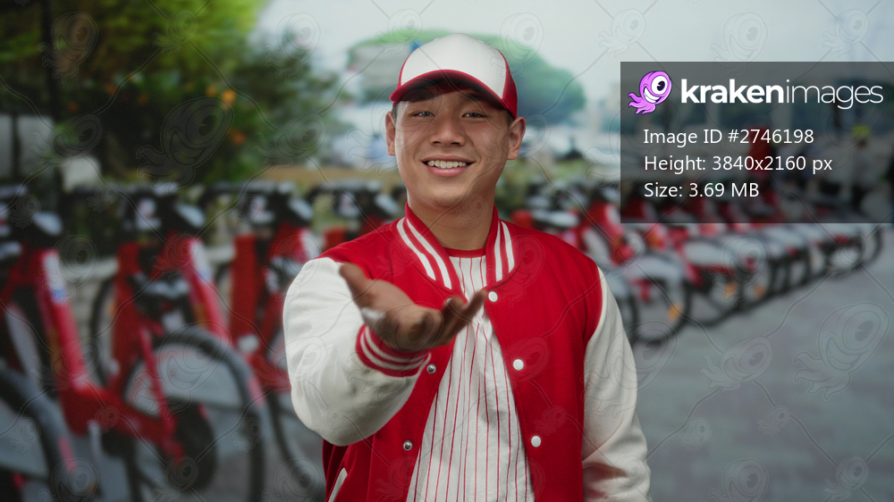 Young man in baseball uniform extends hand to camera smiling on busy city street with rental bikes in background implying friendliness and urban activity. - Kraken Images