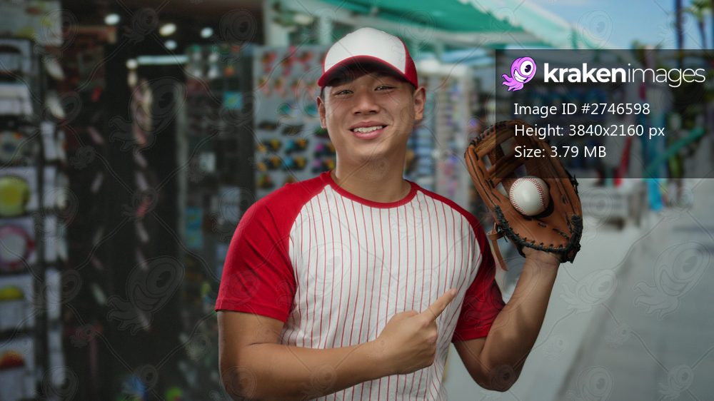 Young man in baseball uniform holding glove with ball, smiling and standing in vibrant city street market.