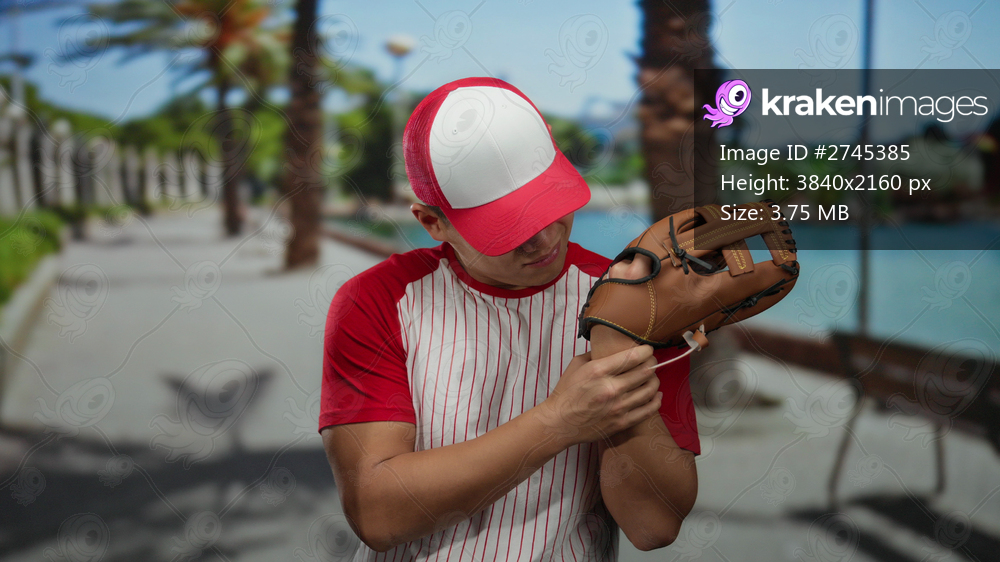 Young man in baseball uniform standing at a seaside promenade with palm trees, holding a baseball glove and looking thoughtful outdoors.