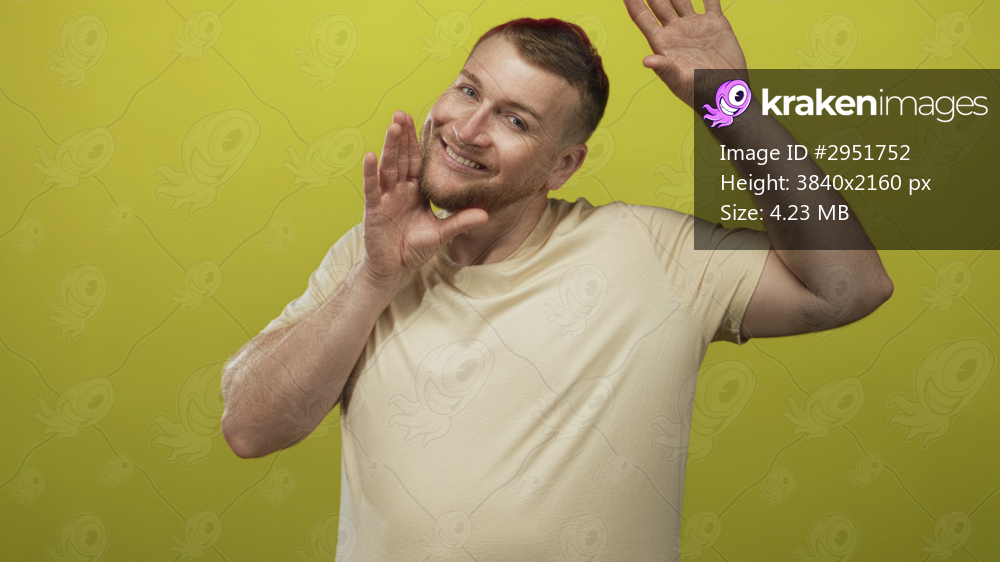 Young man in beige t shirt smiling with hands raised, palms visible and eyes closed in yellow studio, posing playfully for camera; joy playfulness.