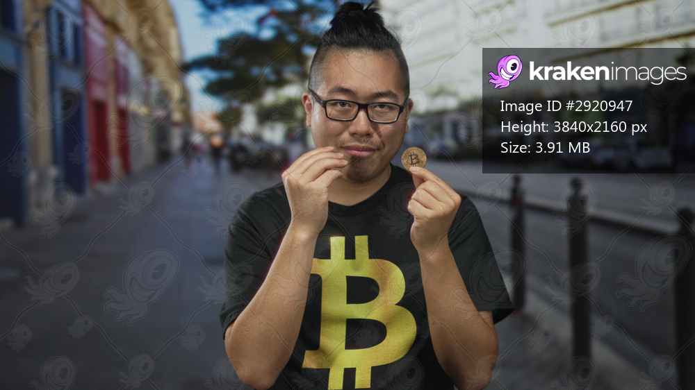 Young man in black bitcoin t shirt holds bitcoin coin between fingers near chest on city street, smiling and gesturing with other hand; investment optimism. - Kraken Images