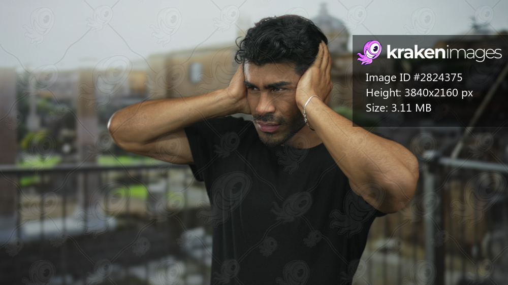 Young man in black shirt covers ears among ancient building ruins under bright morning light; discomfort.