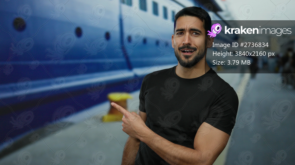 Young man in black shirt pointing at cruise ship in seaside port setting, exuding confidence and joy.