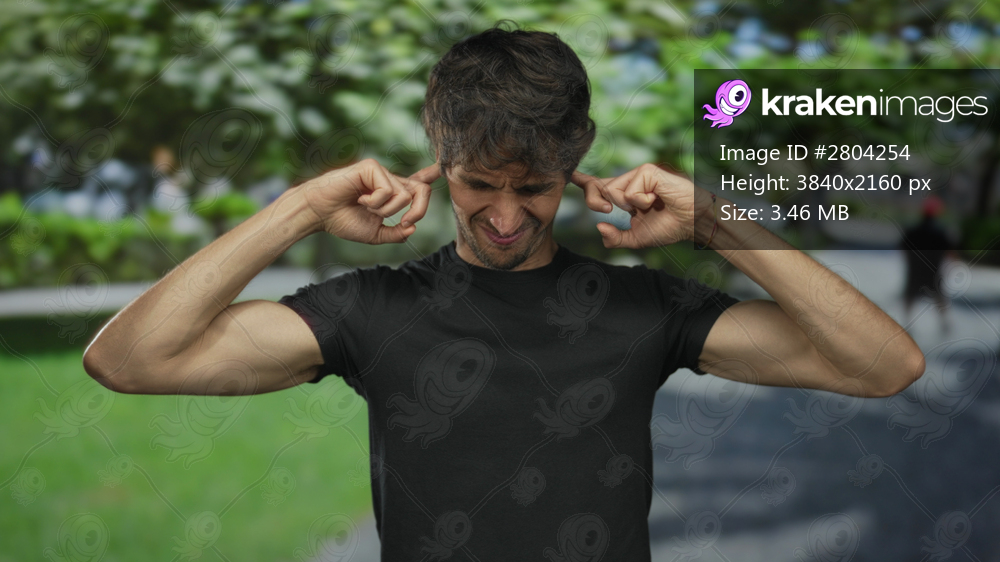 Young man in black t shirt covers ears with fingers under green park canopy beside a paved pathway; annoyance.