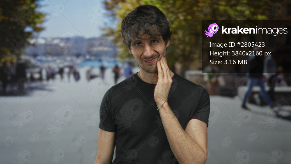 Young man in black t-shirt with hand on cheek on sunny city street; toothache pain discomfort distress.