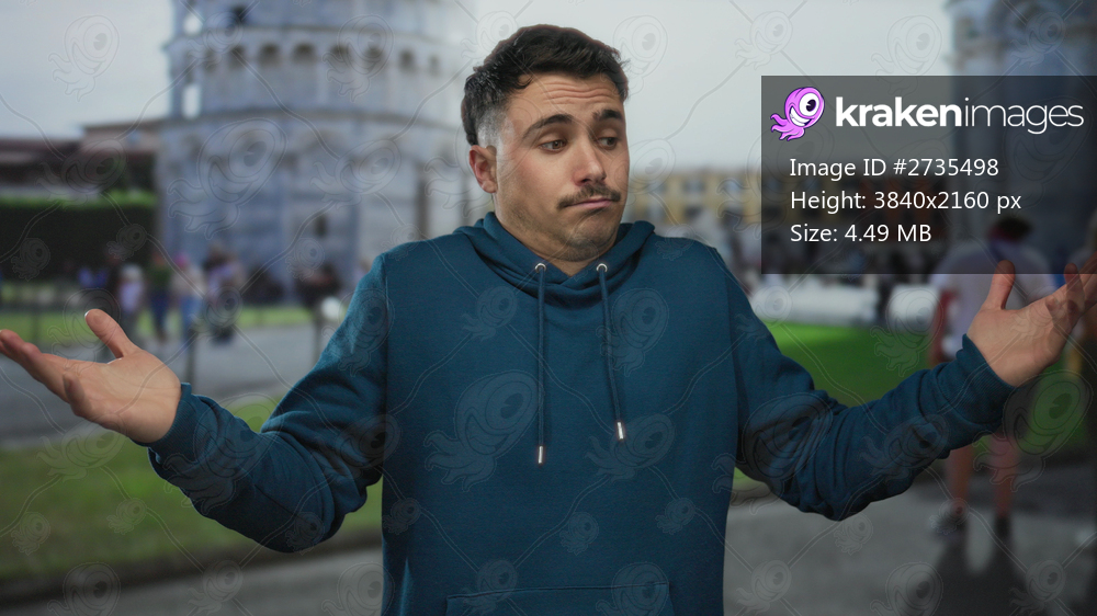 Young man in blue hoodie stands outdoors by pisa tower with a puzzled expression, embodying travel curiosity and contrast among vibrant green landscapes and historic italian architecture. - Kraken Images
