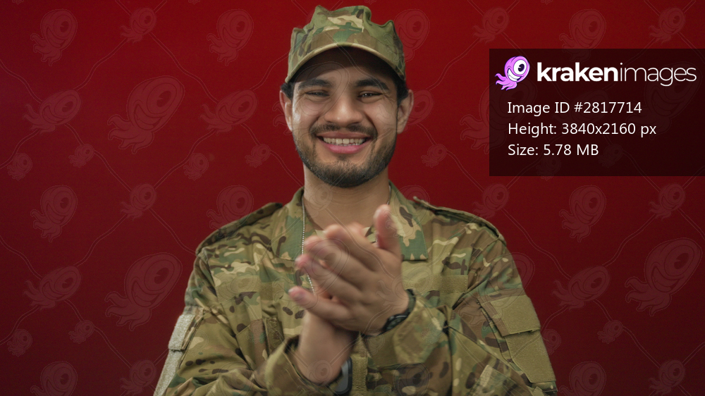Young man in camouflage uniform claps hands and smiles facing camera in studio; pride duty celebration.