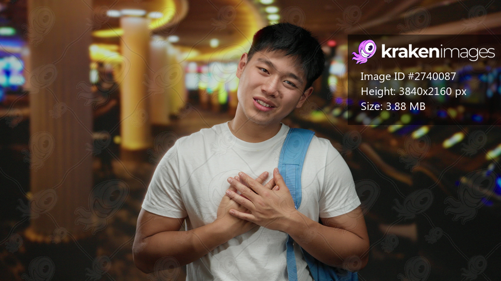 Young man in casino standing near slot machines with a backpack and wearing a white shirt indoors under bright lights expressing emotions with heart sign. - Kraken Images