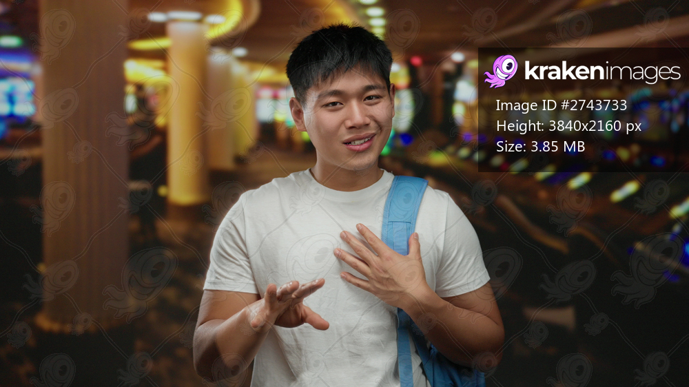 Young man in casino standing near slot machines with a backpack and wearing a white shirt indoors under bright lights expressing emotions with heart sign. - Kraken Images