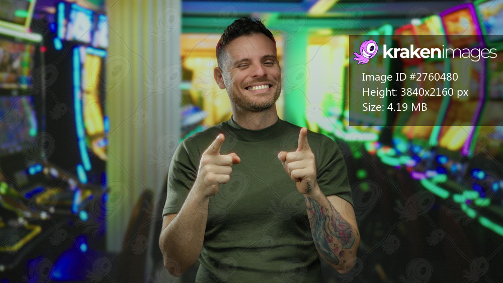 Young man in casino with tattoo expressing joy among bright slot machines in vibrant indoor setting.