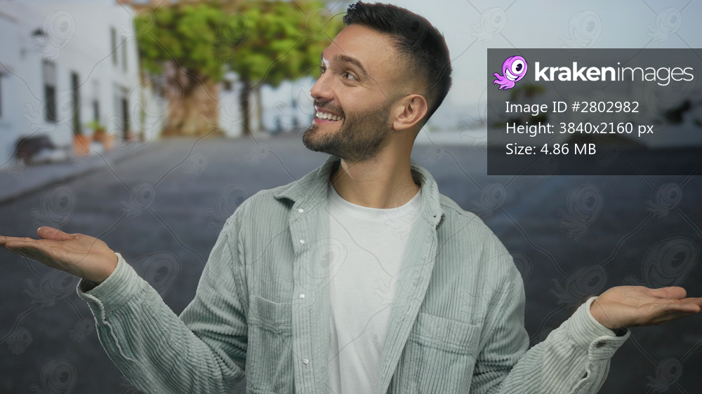 Young man in casual clothing smiles with hands extended on a charming urban street, showcasing a relaxed decision-making gesture in a hispanic city setting outdoors. - Kraken Images