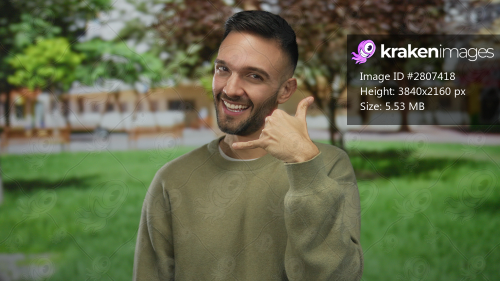 Young man in casual sweater happily gestures with call sign in a lush green park setting, embodying a cheerful, outdoor experience under clear skies.