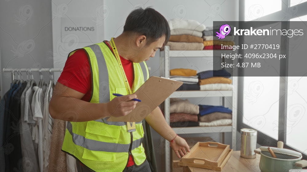 Young man in charity center wearing a safety vest and holding a clipboard, organizing donations in a room filled with clothes and supplies.