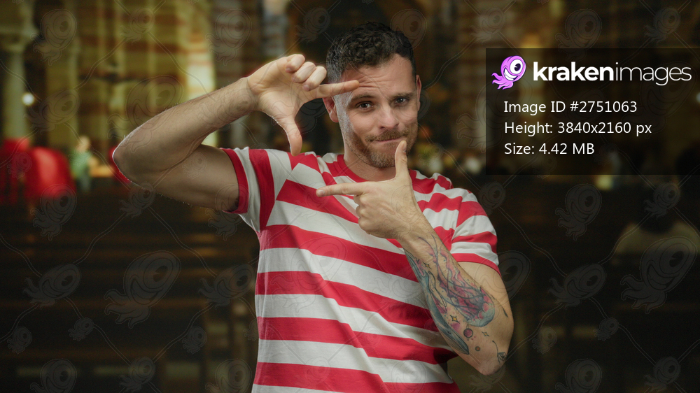 Young man in church smiling with framed hands gesture wearing striped shirt in a church interior suggesting creativity and positivity indoors during the day. - Kraken Images