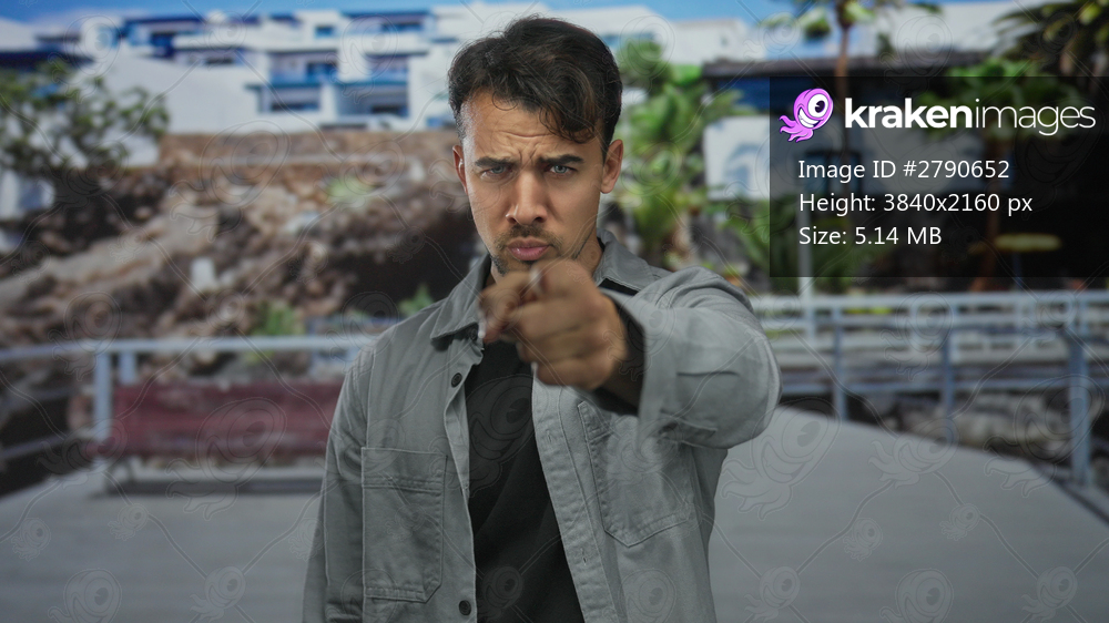 Young man in city street making come here gesture with serious expression outdoors under bright sky.
