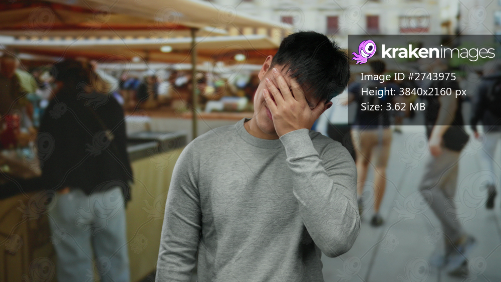 Young man in city street market reacting with different facial expressions surrounded by people shopping outdoors.