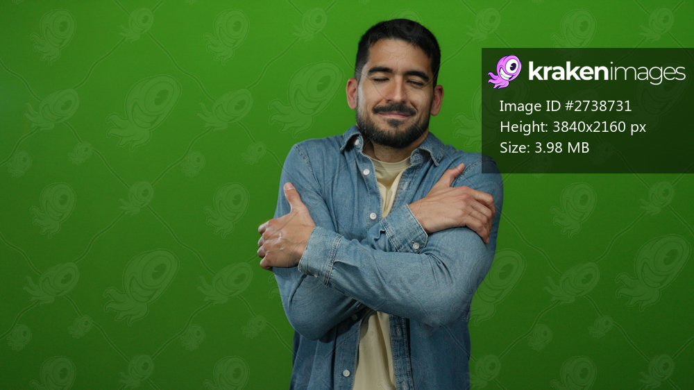 Young man in denim embracing himself with eyes closed against a vibrant green background, exuding self-love and calm in a serene, isolated portrait.