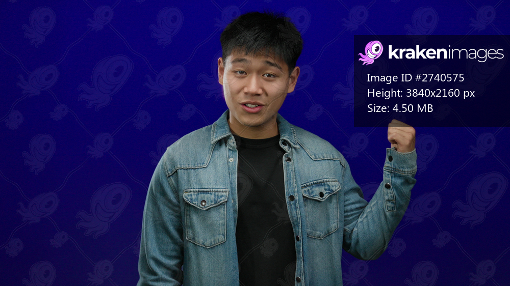 Young man in denim gesturing confidently against isolated vibrant blue background