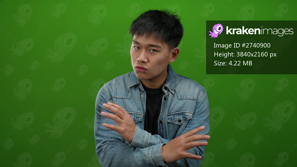 Young man in denim jacket expressing negative emotion against isolated green background suggesting disagreement or no with his hands crossing.