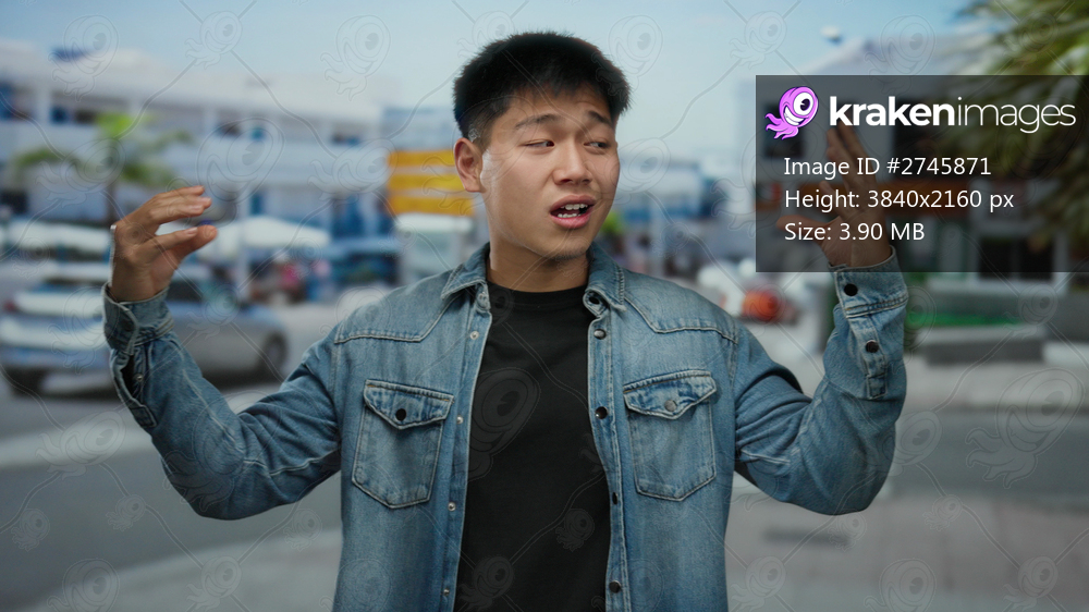 Young man in denim jacket stands on city street looking upward with a thoughtful expression, framed by blurred urban surroundings on a sunny day.