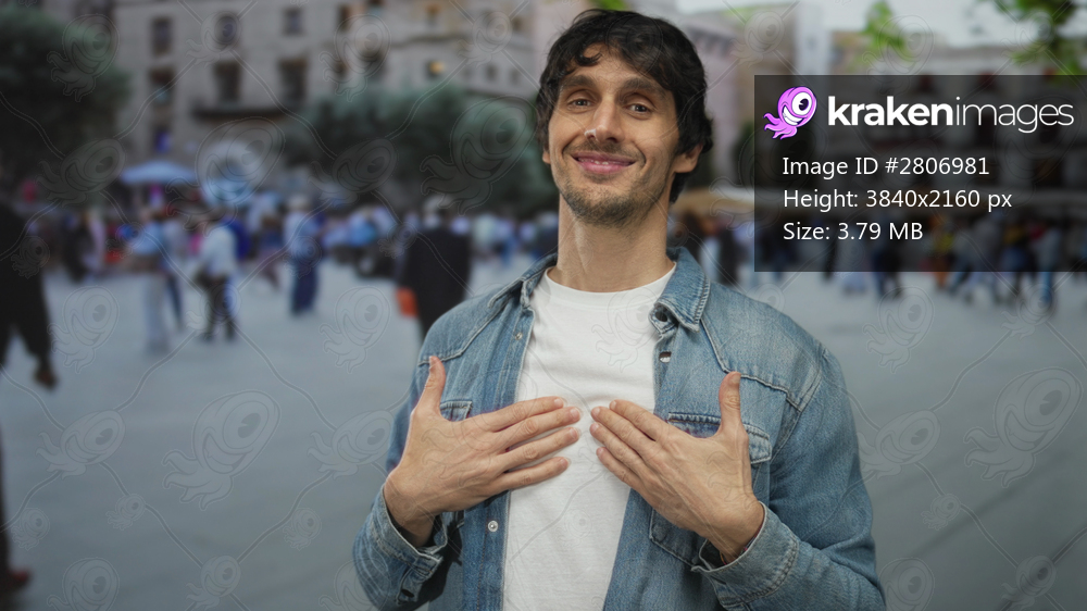 Young man in denim jacket and white tee extending both arms forward on busy city street; friendly invitation.