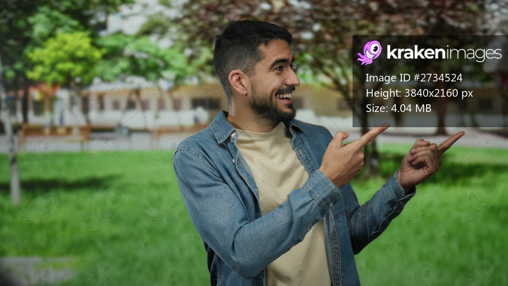 Young man in denim shirt smiling and pointing outdoors in a vibrant green park on a sunny day, capturing a playful and dynamic moment.