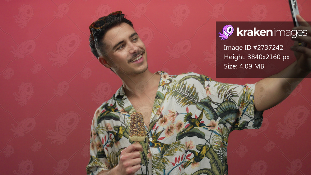 Young man in floral shirt taking a selfie and holding ice cream against a vibrant red backdrop displaying joyful vacation mood.