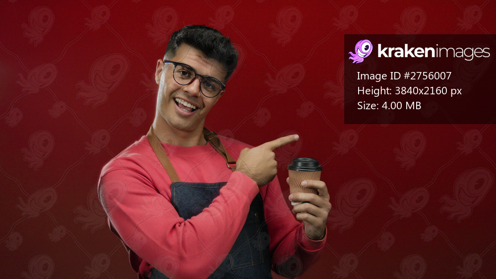 Young man in glasses and apron holds coffee on red background, pointing with expression of enthusiasm and confidence.