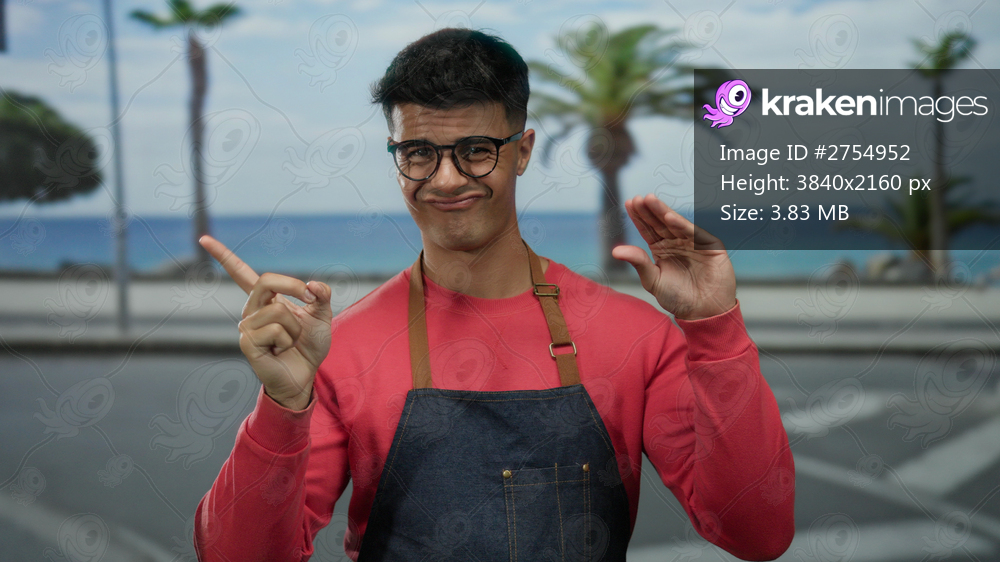 Young man in glasses and apron makes silence gesture on seaside promenade with palm trees and ocean view